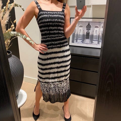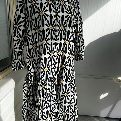 Vintagekjole i stoff som ligner på brokade, veldig festlig både til nyttårsaften og til sommerens strandfester. Størrelsen passer Small og Medium, selv om det står L.