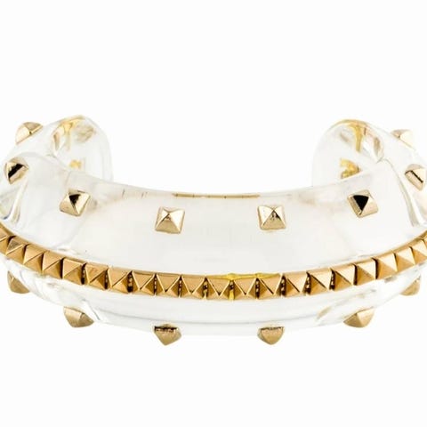 Valentino lær armbånd med gullbelagt metall. Armbåndet er designet for unisex bruk og kommer med spenne og dekorative detaljer. Leveres i original eske og pose.