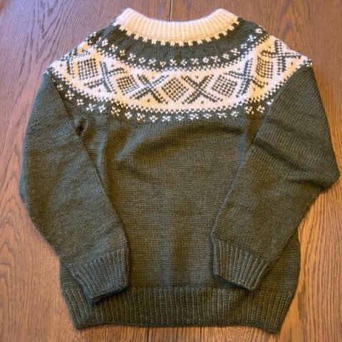 Strikket heldress i Cortina-mønster, str. 3-4 år. Se mål på bildene. Kjempegod og varm dress som fremstår som ubrukt. Pent design i solid og mykt alpakkagarn (Alpakka Forte).