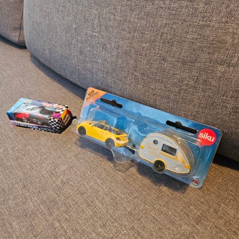 To hvite modellbiler i form av campingvogner. Detaljer inkluderer dører, vinduer og takventilasjon. Passer som samleobjekt eller til lek. kr 200,- per stk