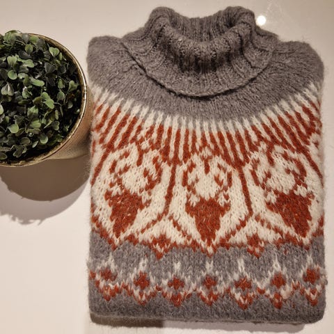 Islandsk ull i dus grønn, brun og offwhite. Tykk, varm og god, fryser ikke i denne!