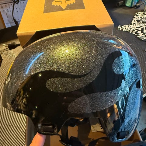 Fox Flight hjelm i størrelse M, hvit farge. Hjelmen er designet for å gi beskyttelse under sykling og har ventilasjonshull for luftstrøm.