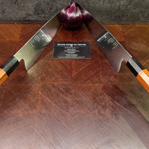 Alle knivene er profesjonelt slipt av meg her i Skarpe kniver og verktøy v/Morten Rodahl. Se bilder iht bruksmerker på knivblader, disse er bevist ikke polert bort da det også ville kunne tatt bort Masahiro logo og orginalprint på kniven.
