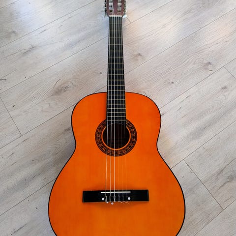 Akustisk gitar med klassisk design. Trekk av treverk på kropp og gripebrett. Instrumentet er beregnet for akustisk spilling uten elektrisk forsterkning.