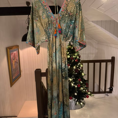 Freya Dress har nydelig mønster og store puffermer. Med den dype v-halsen og innsvingte midjen blir kjolen utrolig flatterende. Brukt en gang.