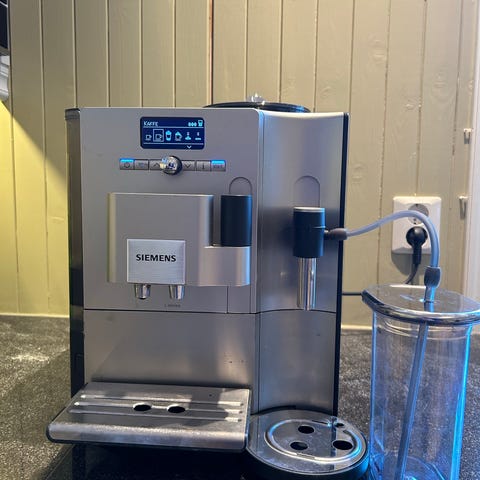 Siemens kaffemaskin i svart farge. Maskinen har en integrert melkeskummer og dryppbrett. Den er designet for å brygge kaffe og espresso med mulighet for justering av styrke og mengde. Enheten har avtagbare deler for enkel rengjøring og vedlikehold. Fungerer som det skal, ingien skade ingen mangler. Ren og klar til bruk.