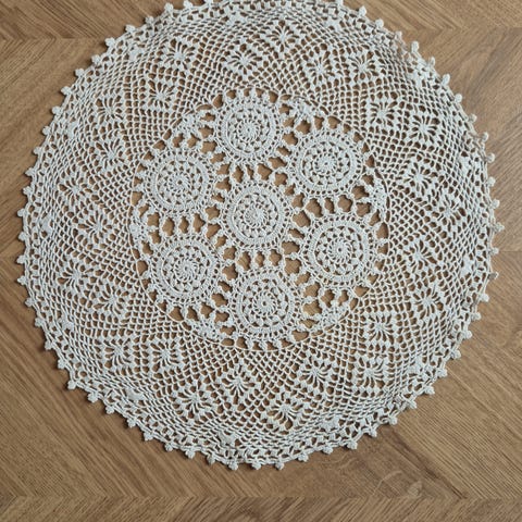 Selger vintage hjemmeheklet duk i hvitt bomull med mål på 70 x 70 cm. Duken egnet som dekorasjon på julebord eller andre anledninger. Veldig fin hånd arbeidet. Pris 299 kr. Kan sendes mot porto med Post Nord.
