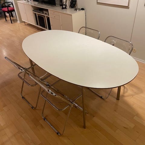 Stolene (5 stk) kan kjøpes for 1000 kr ekstra. Noen av stolene er litt løse, men kan nok limes.