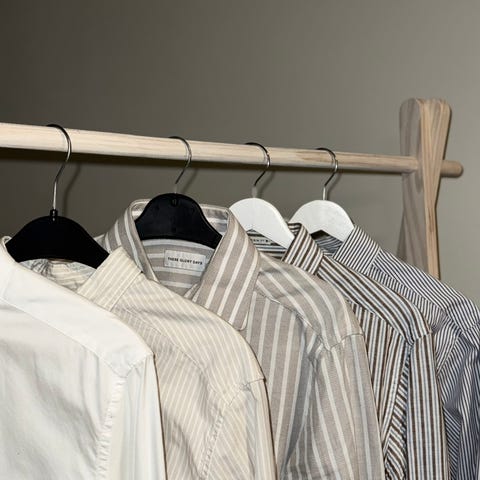 * Hvit med brune og blå striper: slim fit, M, 59% lin og 41%bomull