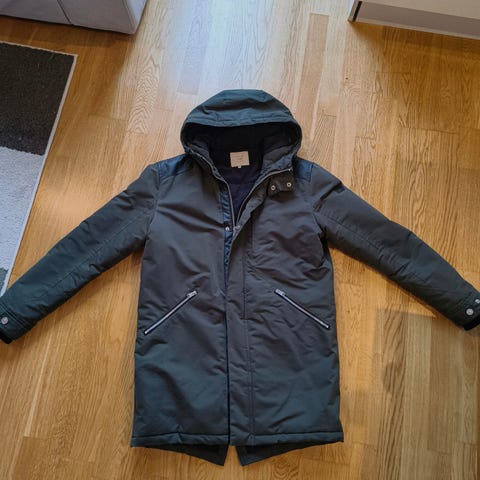 4 stole ytterlommer og en innerlomme med glidlås. Glidlås pluss knapper i hovedfeste og hette med snøring. Veldig lite brukt og sleges siden er for liten for meg nå. Nå pris ca1300,-
