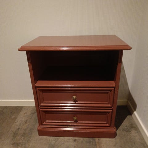 2 stk solide nattbord i heltre. Furu, tror jeg. De er malt hvite. Litt slitasje på malingen, men ellers fast og god stand. De kan sikkert bli knallfine med maling.