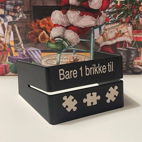 3D printet oppbevaringsboks i form av puslespillbiter i flere farger: blå, rød, grønn, gul og svart. Laget av plastmateriale. Kan brukes til organisering og oppbevaring av puslebrikker.