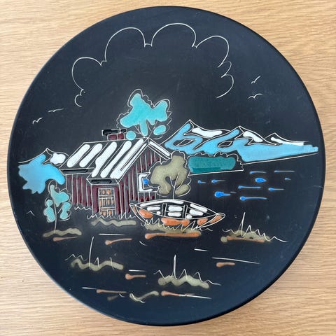 En rund veggplatte i den klassiske matte sorte utførelsen med dekor i blank glasur. "Naust" Fra Arnold Wiigs Fabrikker, Halden. Trolig 1960-tall.