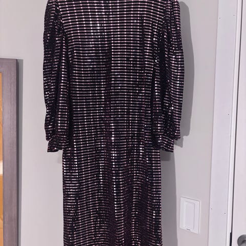 Gina Tricot festkjole i størrelse M, begunder med paljetter. Kjolen har lange ermer og sleng på armene og er laget i materiale med paljetter som gir et dekorativt uttrykk. Egnet til festlige anledninger.