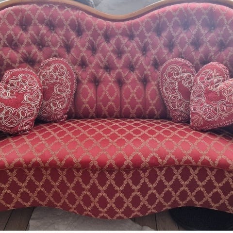 Nydelig sofa, gammelrosa farge med vakre detaljer. God å sitte i og tar liten plass. Noen bruksmerker, fargen i treverket er litt slitt.