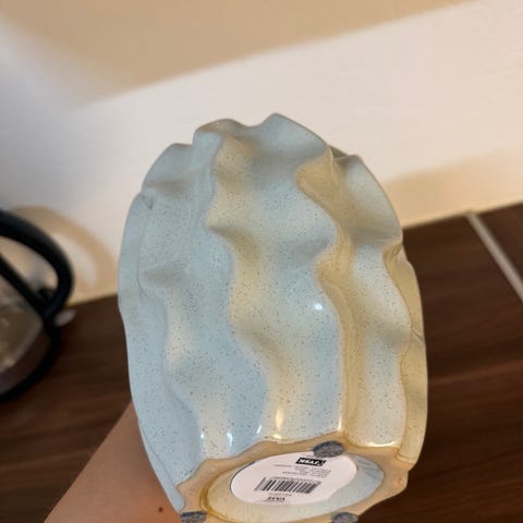 Vasen er i fargen offwhite og har noen synlige merker. Det er ingen riper eller hakk i den.