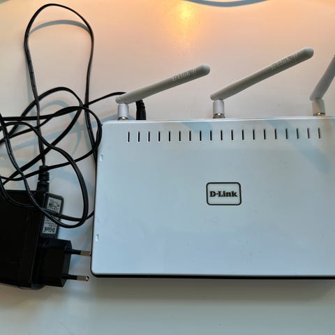 D-Link Router med tilhørende strømadapter og nettverkskabler. Enheten har flere tilkoblingsporter for kablet nettverk.
