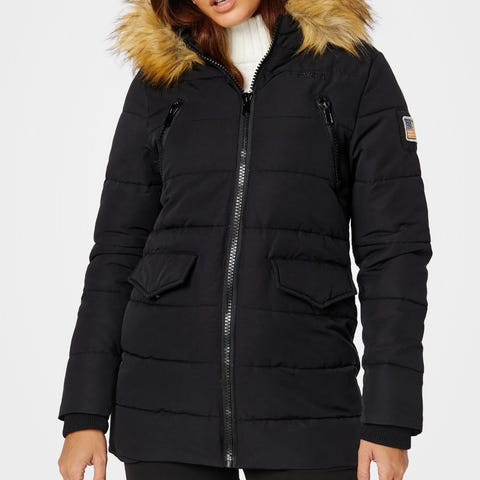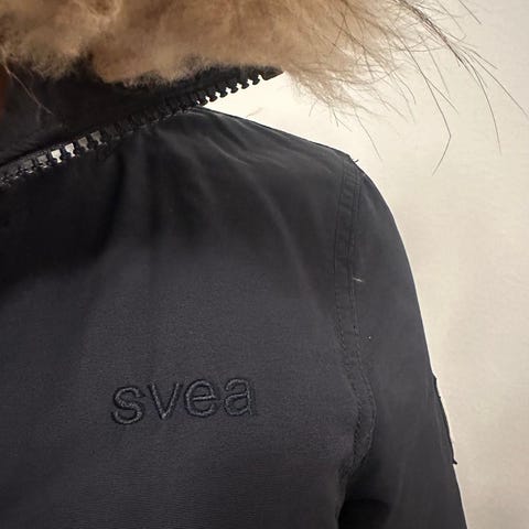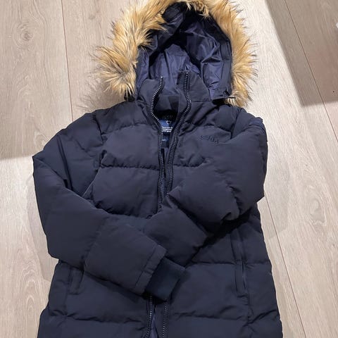 Selger en lang, svart jakke i klassisk modell. Jakken er varm og behagelig, med høy krage, glidelås og trykknapper i front. Praktiske lommer og ribbede mansjetter som holder godt på varmen. Perfekt til høst og vinter.