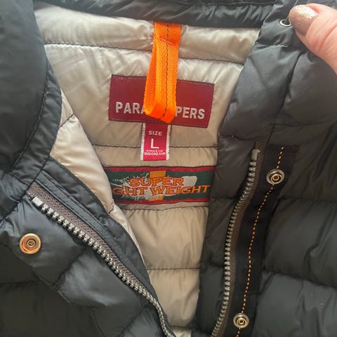 Varm dunjakke med avtagbar hette og fuskepels som også kan kneppes av. Glidelås går begge veier. Uten rifter, hull eller bruksmerker.