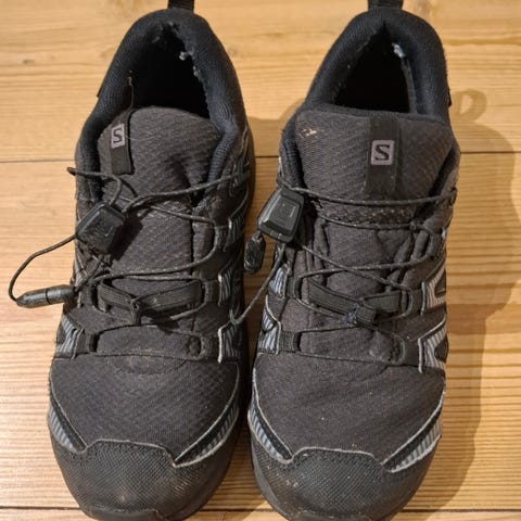 Salomon barnesko i størrelse 33. Skoene har en slitesterk yttersåle og vanntett membran, egnet for utendørs bruk og variert værforhold.