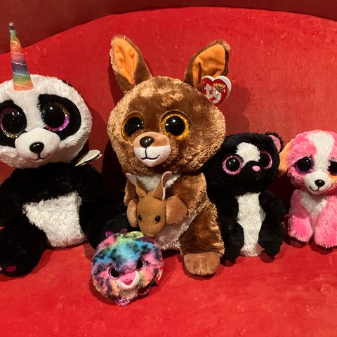 Ty My Little Pony og diverse kosedyr i ulike størrelser og farger. Kosedyrene inkluderer en ponni, en puddel, og flere små dyr. Passer for barn som leker med myke leker.