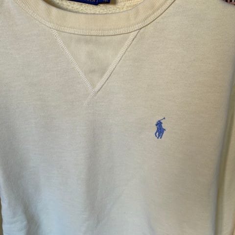 Ralph Lauren Polo genser i størrelse S for menn. Genseren er hvit og laget av bomull. Den har en halv glidelås i front og et flettemønster i strikken. Passer som et lag i kaldere vær eller som en del av en avslappet garderobe. Jeg kjøpte den fra zalando for 1600 men dessverre så var den liten