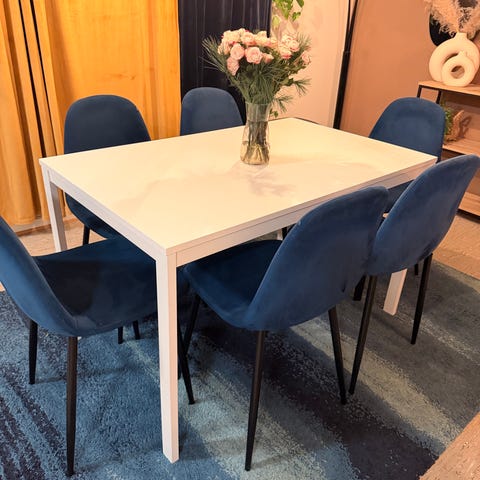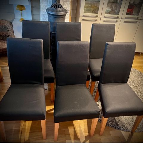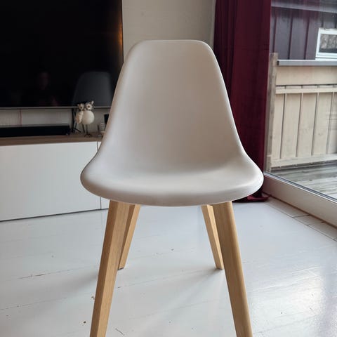 9 hvite spisestuestoler selges. 250 kr pr stol. Stolene er ca 5 år gamle. Sitteputer kan også følge med. Må hentes. Jeg har en ekstra stol som kan følge med om ønskelig (understellet på stolen er litt ødelagt, men stolen er fremdeles i bruk). Kan selges samlet for 1800kr.
