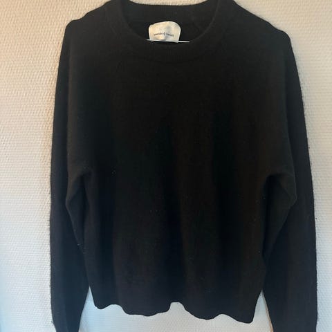 Samsøe & Samsøe kashmir genser med dyp V-hals. Fargen er litt varmere og enn på bildene. Genseren er i størrelse M ( litt romslig) og designet for damer. Modellen kostet ny 3000kr, og er ikke brukt. Den har likevel fått et lite hull på undersiden av den ene albuen fra en møll som var på besøk. Hullet er reparert, se bildet.