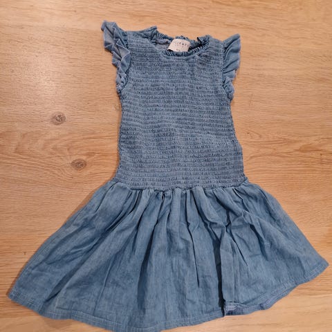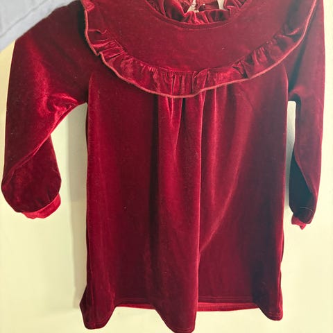 Nydelig mørk blå kjole i fløyel med liten krage og silkebånd i midjen. Kjolen har glidelås bak. Julekjole