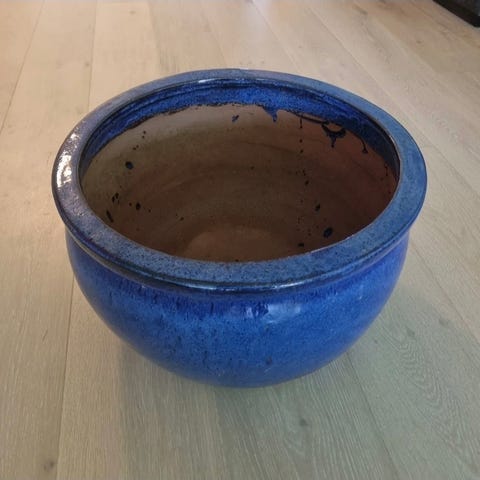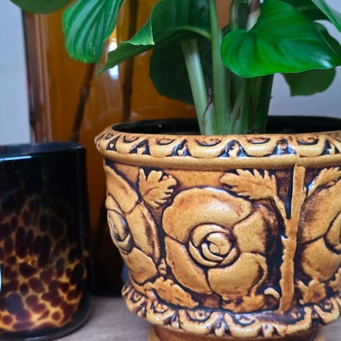 Vintage keramisk blomsterpotte med dekorative mønstre og rosa blomstermotiv. Potten har en unik form med buede kanter og fire ben som støtte. Høyde 13 cm og 18 cm i diameter.