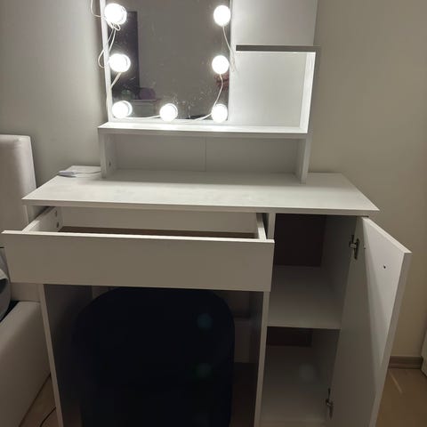 Selger dette praktiske sminkebordet på grunn av mangel på plass. Det er i svært praktisk størrelse til lite soverom (60x40x140). Sminkebordet har også mulighet for belysning med forskjellige lysstyrker. Det er forsøkt å vise på kamera at det er noen frakt skader som har skjedd før jeg fikk levert det, men disse er ikke særlig synlige.