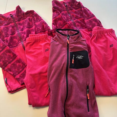 Skogstad fleece barneklær for jente i størrelse 128. Sett bestående av jakke i rød og lilla farge og matchende lilla fleecebukse. Laget av fleece materiale, egnet for barn.