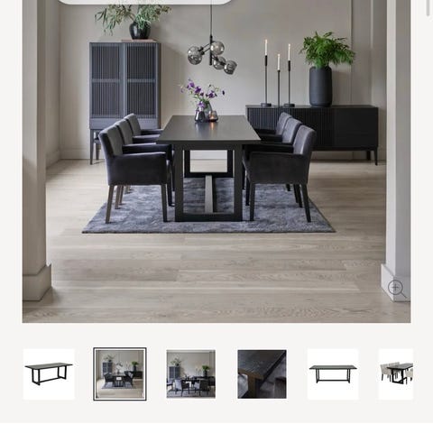 Spisebord med 6 stoler i velur trekk, medfølger 2 lemmer. Noen bruksmerker , se bilder.