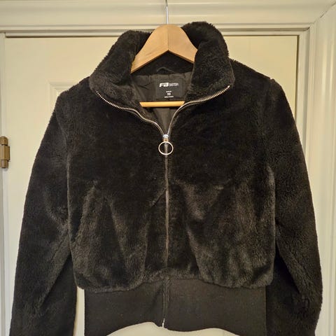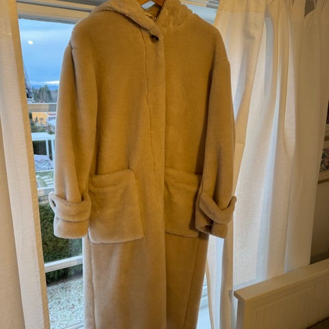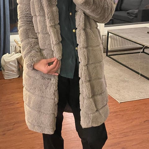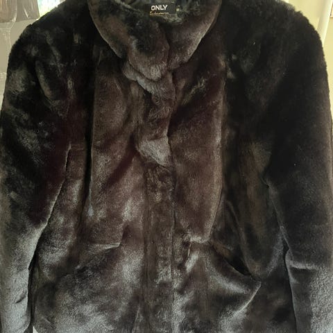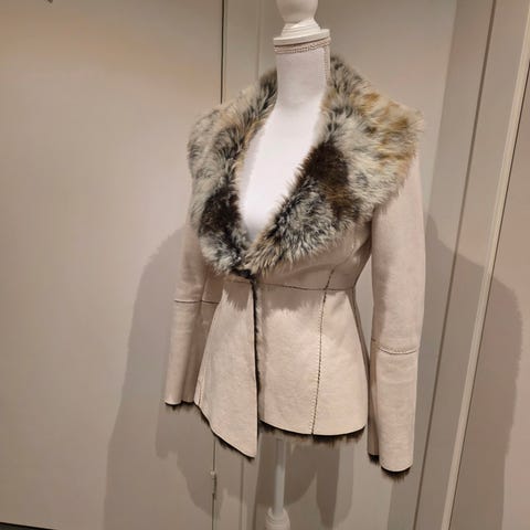 Fuskepels Annet yttertøy i hvit farge, størrelse XS for dame. Jakken er laget av kunstig pelsmateriale og har et mønstret innerfôr.