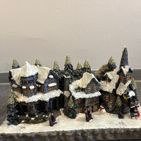 Integrert juletrebelysning drives av 2xAA batterier, alle lys virker. Det følger også med en sokkel med lyspære som settes inn under huset så det blir innvendig belysning, denne drives via stikkontakt på 230v.