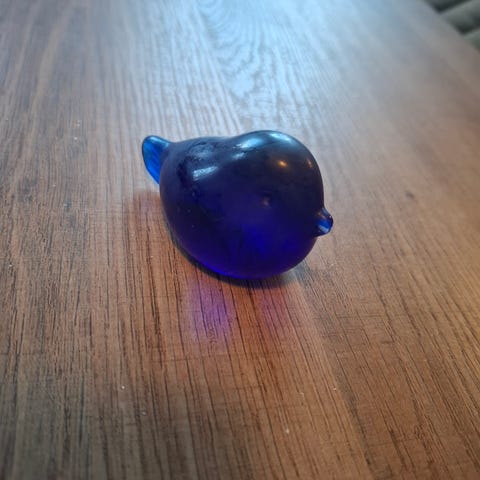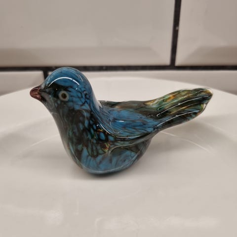 Glassfugl dekorasjon i rødt, svart og hvitt glass