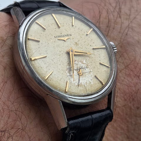 Klokken trekkes lett opp og går fint, men har ukjent servicehistorikk. Alt på klokken er originalt, inkludert kronen. Den avbildede reimen følger med.