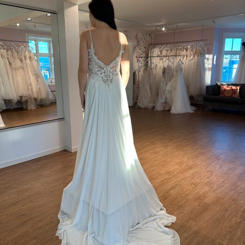Nyyydelig klassisk brudekjole. Bestilte 2 stk av kjolen og har hatt den ene hengende siden. Den er helt ubrukt og i «forseglingen» sin i en egen klespose til kjolen. Størrelse 36. Jeg bruker 36/38 og den satt som et skudd. Pris diskuteres ikke. Kjolen lages ikke lenger.