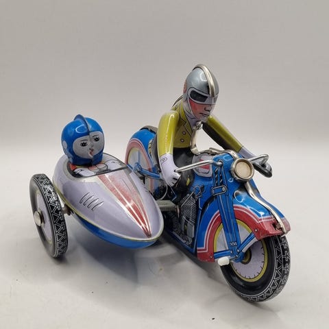 Huki, Hubert Kienberger, blikkleketøy, vintage leketøy, tin toy, motorsykkel leke, Made in Western Germany, ges gesch, samlerobjekt, friksjonsleketøy, tysk leketøy, 1950-tallet, 1960-tallet