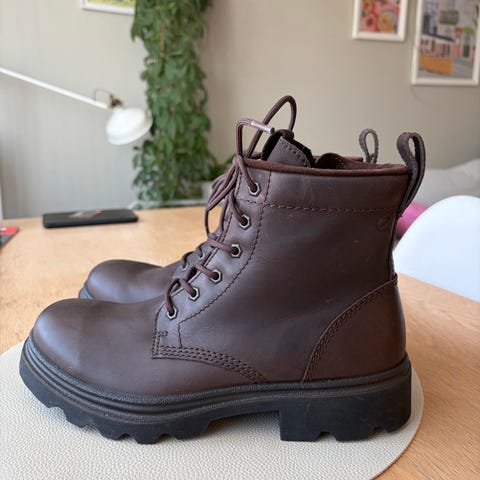 ECCO støvler i størrelse 42 med brun farge. Støvlene har snøring og glidelås på siden for enkel på- og avkledning. Sålen er kraftig med godt grep. Innvendig fôr gir ekstra komfort.
