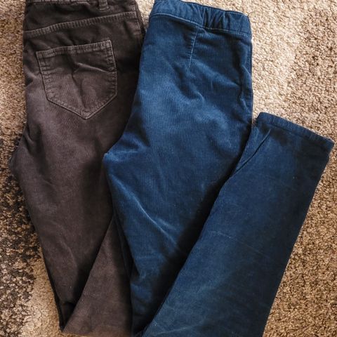 3 fine bukser med god stretch og utsvingte ben. En sort (KappAhl) litt tykk bukse (brede/ litt rettere ben), to i fløyel (Leopard (Lindex) og svart (KappAhl). Str 134. Pent brukt av en jente i noen måneder før hun plutselig ble for høy for de.