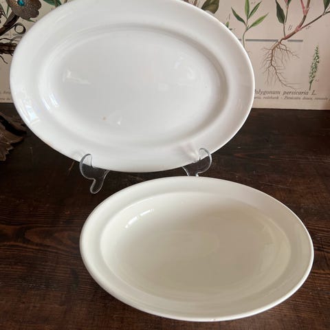 Det er ca 25 cm i diameter der 'hankene' er - og ca 23 cm i diameter ellers. Står på '54' - som jeg leser på nett betyr produksjonsåret. Studere bildene og se at det er i fin tilstand. Noe synlig slitasje på gullkanten, men tatt i betraktning at den er over 70 år gammel, så er den meget bra.