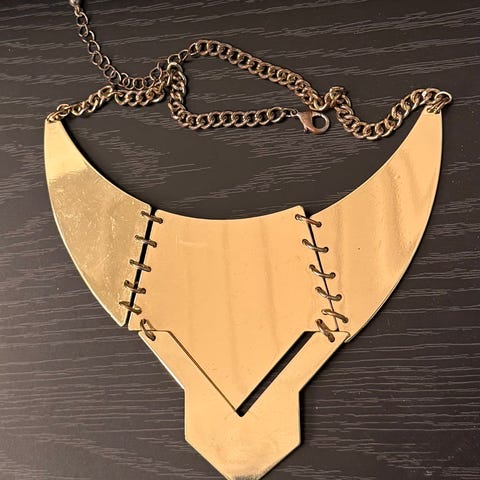 Statementsmykke. Halskjede laget av metall med unike firkantede ledd som danner et mønster. Designet består av sammenkoblede firkantede elementer med et rustikt utseende. Unisex