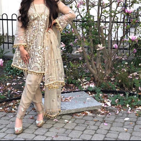 Pakistansk Festkjole i rosa chiffon, størrelse one size. Kjolen har detaljer som broderier og perler, og er egnet for kvinner.