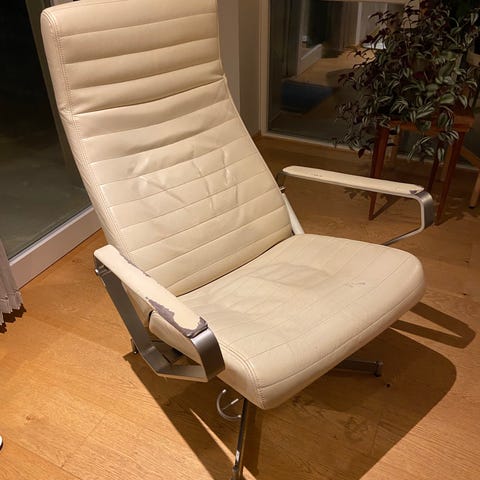 Nydelig hvit skinnstol med puff. Stolen har kjekk sving. Pent brukt.
