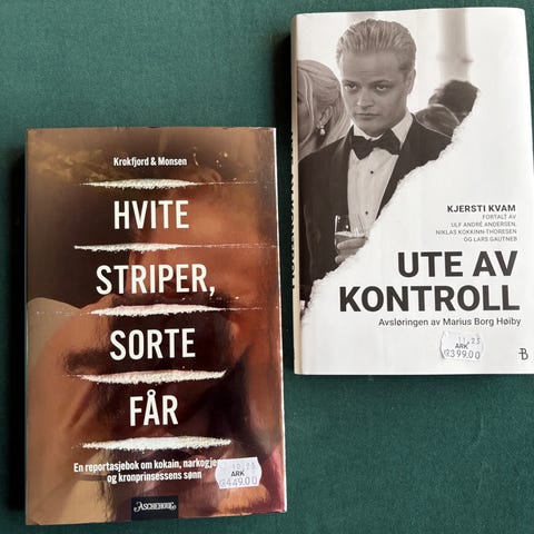 Prisen er per stk. Ute av kontroll og Hvite striper, sorte får. Inneholder avsløringer av Marius Borg Høiby. Norsk språk. Nypris 449 kr.