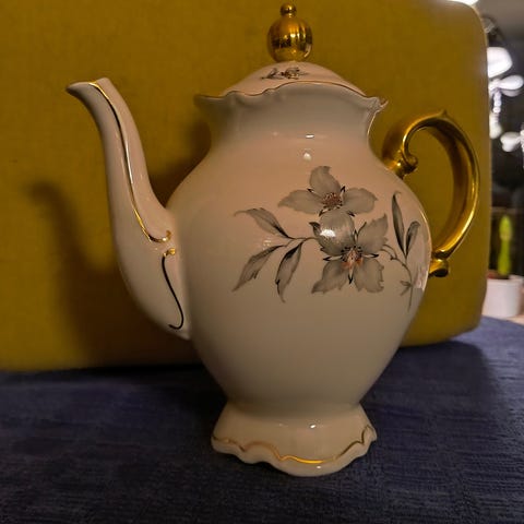 Vakker kaffekanne fra Porsgrunn porselen. Den rommer 1,3 liter. Høyde med lokket: 25 cm