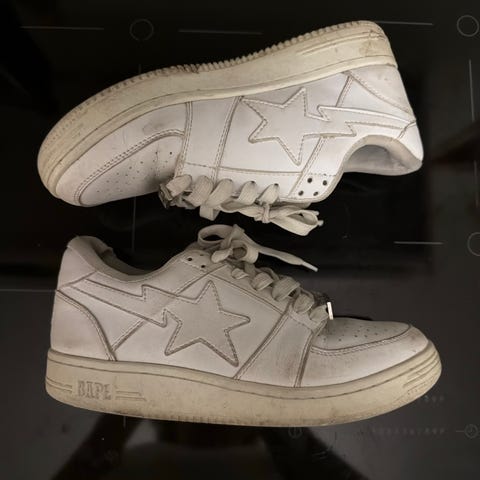A BATHING APE x ADIDAS Stan Smith sneakers i størrelse 43 og 1/3 eller size 9 med camo mønster. Modellen har klassisk design med hvite lisser og detaljer i gullfarge. Skoene er laget i materiale tilpasset joggesko.