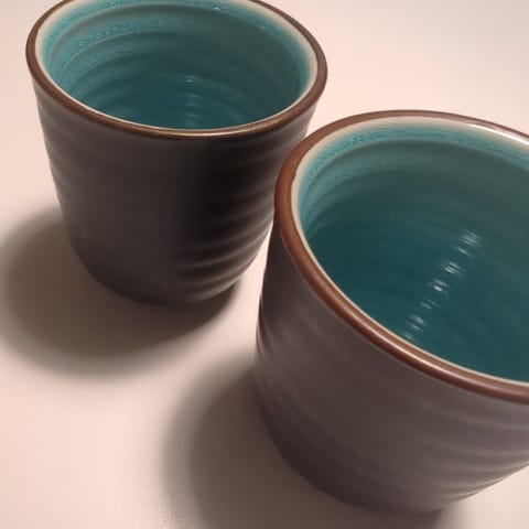 Håndlagde keramikkskåler, inspirert av Berlin, med hvite glasurdrypp.