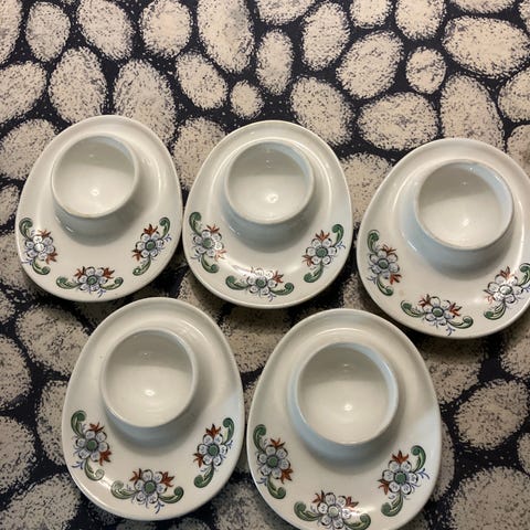 Består av 6 stk kuvert med kopp skål asjett og tilhørende eggeglass